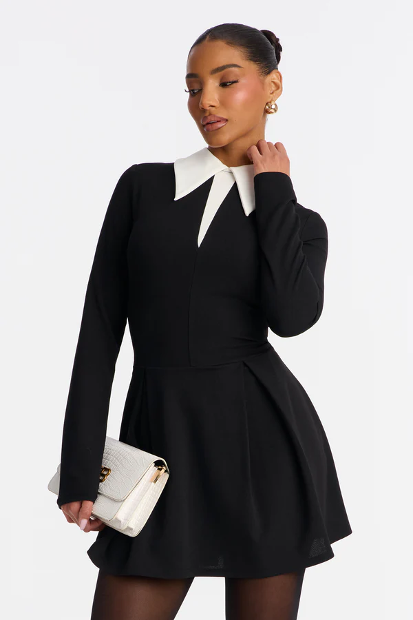 A black and white long sleeve mini dress designed with refined pleating and a structured silhouette for polished day to evening wear.