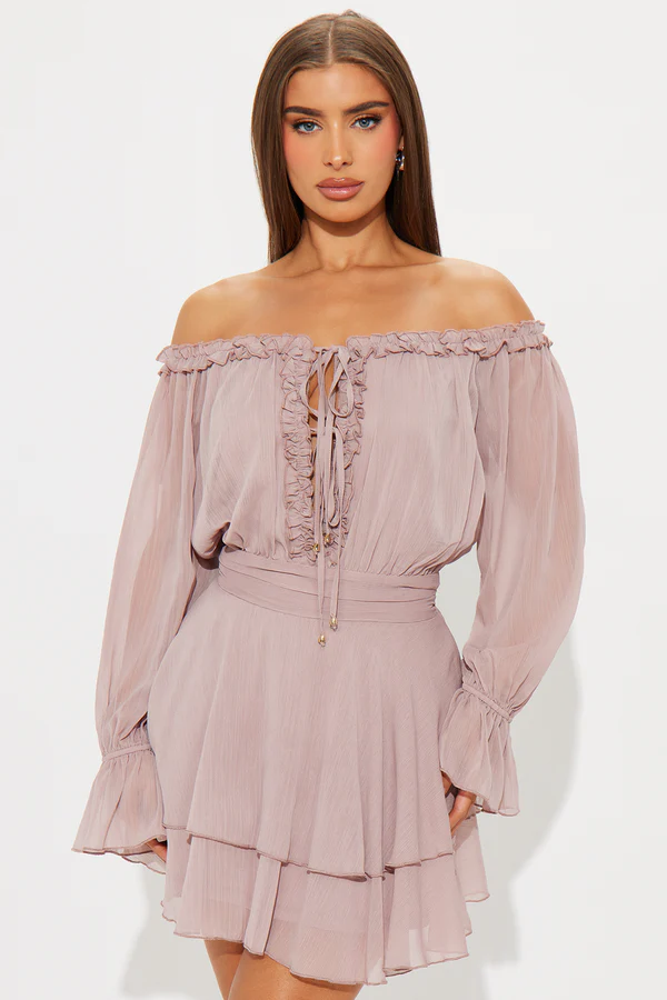 A pink chiffon mini dress designed with long sleeves and a soft flowing structure for refined feminine styling.